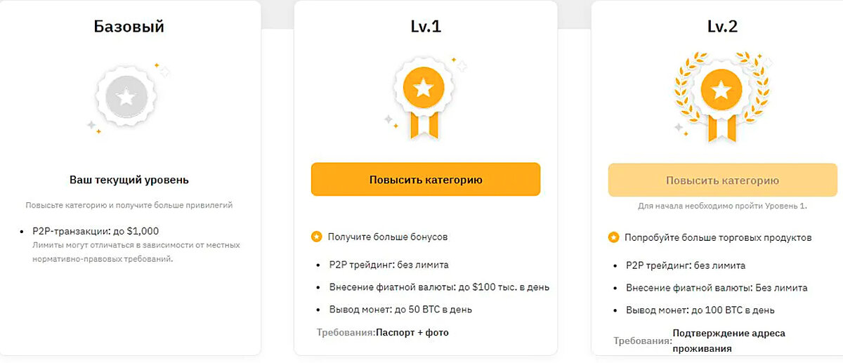 Далее нужно будет пройти верификацию. Для этого в своем аккаунте нажмите кнопку «Верификация личности» и выберите уровень Lv.1 – его будет достаточно для всех наших следующих операций.