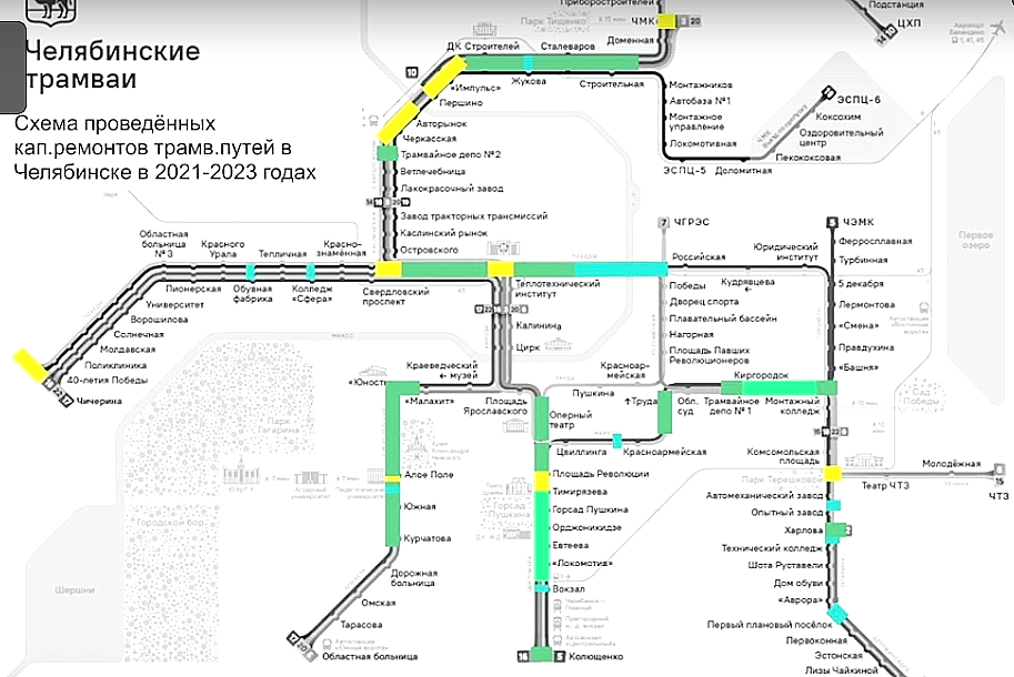 В Челябинске рассказали о планах по развитию трамвайной сети и ремонту трамвайных путей в 2024 и последующих годах. На пресс-конференции в южноуральском Центре управления регионом заместитель министра транспорта и дорожного хозяйства Челябинской области Александр Егоров сообщил, что количество вагонов, ежедневно выходящих на линию, к концу года планируется дорастить со 140 до 170; при этом на улицах города будут чаще появляться сцепки, то есть двухвагонные трамваи. Общий запланированный объём трамвайного парка в декабре этого года — 201 единица (сейчас — 141). Кроме того, частью общего парка в ближайшем будущем станут 32 трёхсекционных вагона метротрама. Радикально избавляться от старых вагонов пока не планируется: часть из них рассчитывают продать, прочие будут использоваться в качестве резерва. Важной частью развития сети Александр Егоров назвал обособление трамвайных путей: на сегодняшний день временными столбиками и бордюрным камнем обособлено 96% перегонов. Результатом этого и про