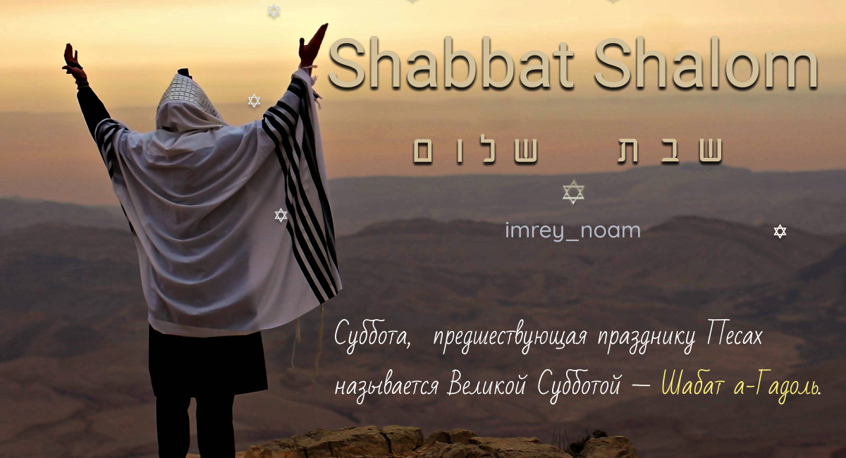 называется Великой Субботой — Шабат а-Гадоль. Доброй и мирной субботы в кругу родных и близких! Недельная глава Мецора Ознакомиться с недельной главой можно здесь: https://imrey.org/tag/глава-мецора Время зажигания свечей/ исход шаббата Иерусалим — 18:31/19:50
