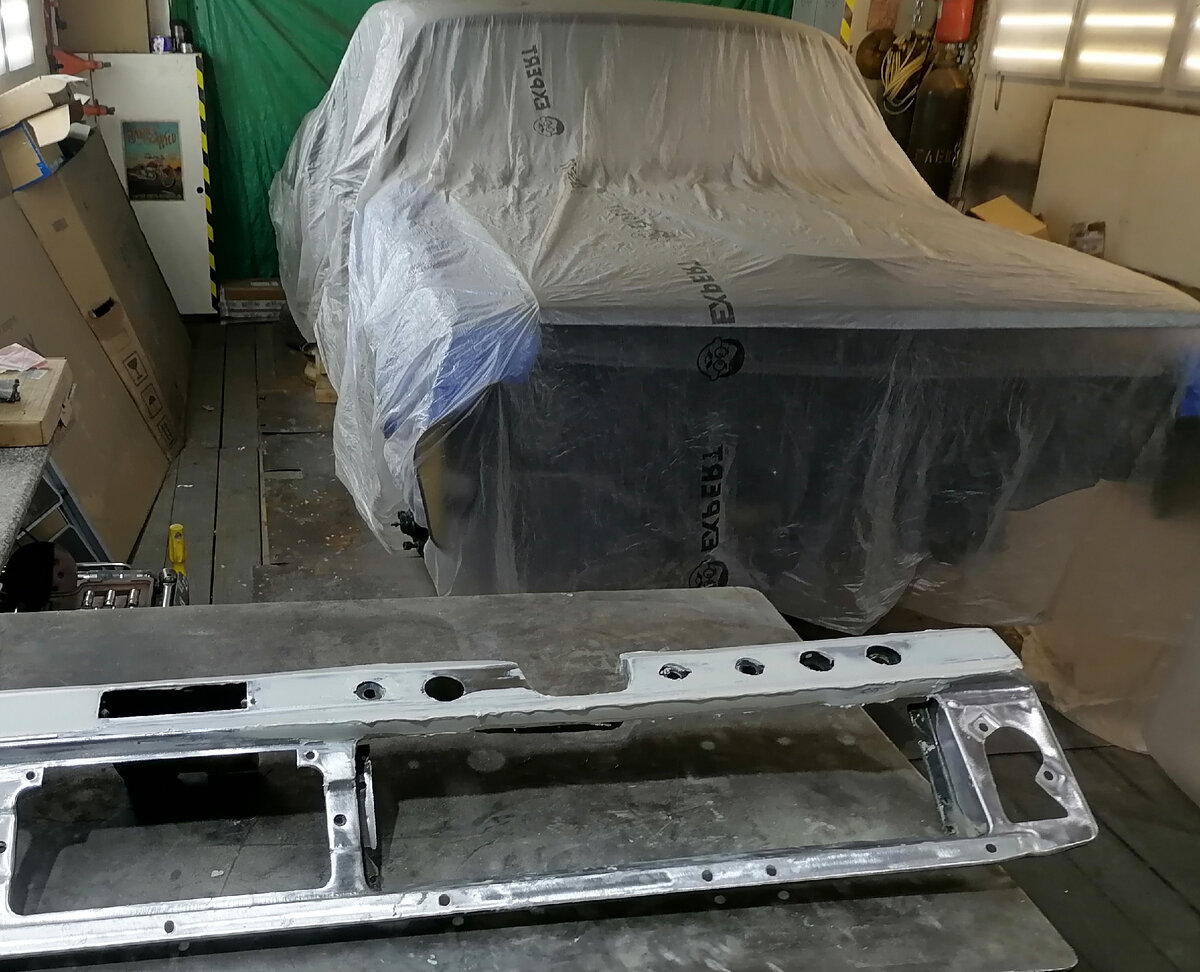 ... Продолжение. В моей машине 1979 г.в. заводская "торпедо", или передняя панель, кому как угодно, была "мягкой" - металлическое основание покрыто мягким материалом и винилом. Увы, со временем покрытие потрескалось во многих местах и восстановить его до приличного вида было бы крайне сложно. Кроме того, на более ранних машинах торпедо устанавливалось с металлической нижней частью, что как помне - гораздо более интересно. Именно такой вариант мне удалось приобрести на разборке, в очень приличном состоянии. При переварке кузова я заложил крепление торпедо со смещением вправо на 30 мм, чтобы выровнять положение руля относительно водителя. Соответственно и вырез под рулевую колонку в самой панели был выпилен и переварен с таким же смещением. На всякий случай еще раз все прикидываю, чтобы убедиться в совпадении крепежных элементов. Все в порядке, можно разбирать и готовить к покраске. Снимаю верхнюю часть (она на болтах), пепельницу, гнездо прикуривателя. Остается голая железяка. Пров
