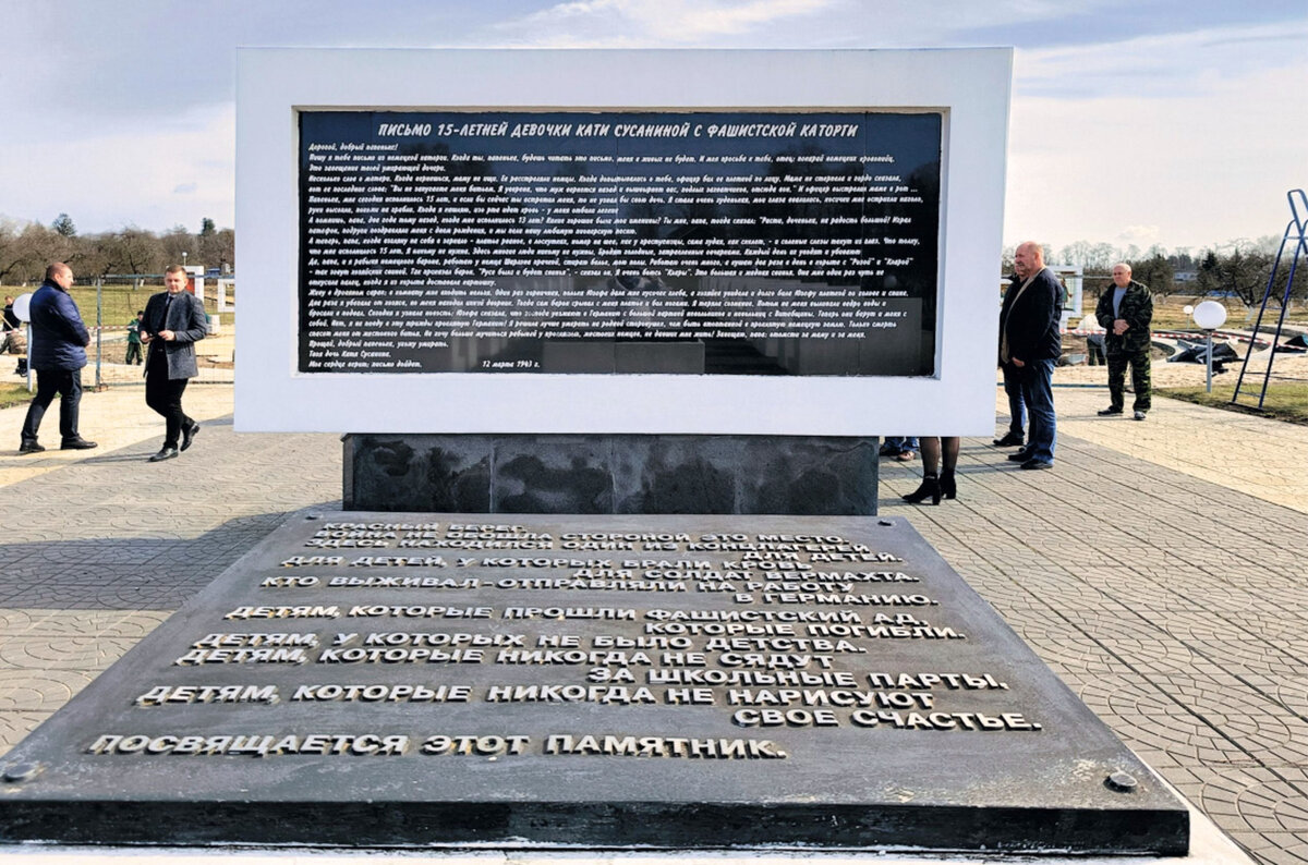 На доске страшное письмо ребенка. Это предсмертное письмо-завещание 15-летней Кати Сусаниной отцу. Его нашли, когда разбирали кирпичную кладку разрушенной печи в одном из домов в освобожденном райцентре Лиозно, что в Витебской области. Конверт был зашит белыми нитками по всему периметру. На нем стоял адрес: «Действующая армия. Полевая почта №… Сусанину Петру». А на обратной стороне надпись: «Прошу того, кто найдет это письмо, бросить его в почтовый ящик, так как меня в живых уже не будет». В Лиозно эта девочка была в рабстве у одного оккупанта и 12 марта 1943 года, в день своего 15-летия, более не в силах терпеть издевательств, покончила жизнь самоубийством. Перед этим она написала письмо отцу, который был на фронте. Письмо было найдено в 1944 году. Оно не дошло до адресата.