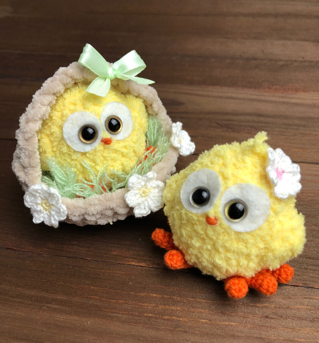 Необходимые материалы: пряжа Alize Softy желтого цвета, пряжа Alize Cotton Gold Hobby оранжевого цвета, фетр белого цвета, глазки 6 мм, синтепух, крючок 2,5 мм. Условные обозначения: сбн — столбик без накида; вп — воздушная петля; пр — прибавка; уб — убавка; со — соединительный столбик. КА — кольцо амигуруми. Глазки. Из белого фетра вырезаем два одинаковых кружка диаметром примерно 10 см. Для удобства можно обвести колпачок) Дыроколом делаем отверстие для продевания глазок. Туловище. Пряжа Alize Softy желтого цвета. 1. 6 сбн в КА. 2. (пр)*6 (12 сбн). 3. (пр, 1 сбн)*6 (18). 4. (пр, 2 сбн)*6 (24). 5. Вяжем 2 ряда без изменений (24). 6. (пр, 3 сбн)*6 (30). 7. Вяжем 6 рядов без изменений (30). 8. (3 сбн, уб)*6 (24). 9. На данном этапе вставляем глазки, фетр приклеиваем термоклеем или клеем «Момент». 10. Набиваем синтепухом. 11. (2 сбн, уб)*6 (18). 12. (сбн, уб)*6 (12). 13. 6 уб. (6) стянуть отверстие и отрезать нить. Крылья. 1. 6 сбн в КА. 2. (пр)*6 (12). 3. Пров