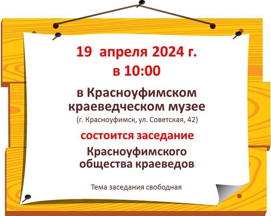 Публикуем программу мероприятий на ближайшие дни. Внимание, она может меняться и дополняться. 19 апреля 10.00 — заседание Красноуфимского общества краеведов (краеведческий музей, 12+); 10.00-13.00 — муниципальная акция «Помоги ближнему» (площадь у Свято-Троицкого собора», 6+). 14.30 — круглый стол «Перспективы и организационные вопросы трудоустройства несовершеннолетних в летний период 2024 года» (КМЖ «Перекресток», 12+); 17.00-18.00 — «Трогательная прогулка» (городская набережная, 4+). 20 апреля 9.00 — турнир по настольному теннису, посвящённый памяти Г. В. Потырина (спортивный зал локомотивного депо, 6+); 10.00 — фестиваль Всероссийских спортивных соревнований школьников «Президентские состязания» (стритбол) (ФОЦ «Сокол», 6+); 11.00 — шахматный турнир «Маленький коняшка» (школа №3, 4+, регистрация здесь). 14.00 — Библионочь-2024 (Центральная библиотека, 4+); день открытых дверей в Красноуфимском педагогическом колледже. 21 апреля 9.00 — турнир по лазерному бою «Тактический штурм» (ФО