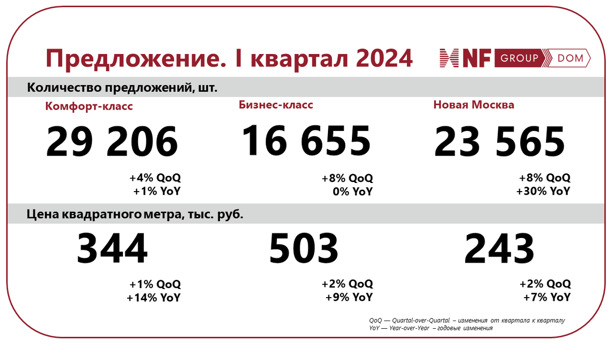 По итогам I квартала 2024 года цены на недвижимость комфорт-класса в Москве выросли на 1% до 344 тыс. рублей за кв. метр, на недвижимость бизнес-класса — на 2% до 503 тыс. рублей за кв. метр, в Новой Москве — на 1% до 243 тыс. рублей за кв. метр. Во II квартале 2024 года ожидаем, что в преддверии окончания действия программы ипотеки с господдержкой спрос на недвижимость вырастет, что выльется в её удорожание на 5–7% за квартал. Во II полугодии 2024 года девелоперы будут использовать различные механизмы продаж, которые будут частично закладываться в стоимость недвижимости. То есть цены на недвижимость за 100% оплату может быть несопоставима с ценами на недвижимость, приобретаемую с использованием финансовых инструментов. Что касается цен на недвижимость без применения фининструментов, то, мы полагаем, девелоперы будут стараться сохранить текущий уровень цен. Наши самые свежие новости попадают в телеграм: