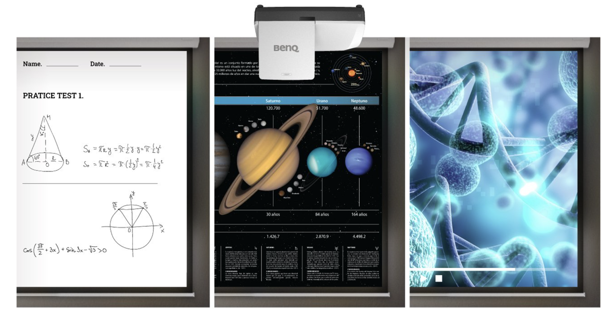 В сфере образования помимо обычных проекторов, которые располагаются на расстоянии более 2 метров от экрана, часто используют короткофокусные и ультракороткофокусные проекторы. Короткофокусные проекторы могут проецировать изображение с диагональю 100” c расстояния 75 - 100 см, а УКФ-проекторы - с расстояния 25 - 50 см от экрана, то есть их закрепляют практически у самой стены. При этом тень от докладчика не перекрывает экран, а яркий свет от проектора не ослепляет его, когда он стоит лицом к классу.