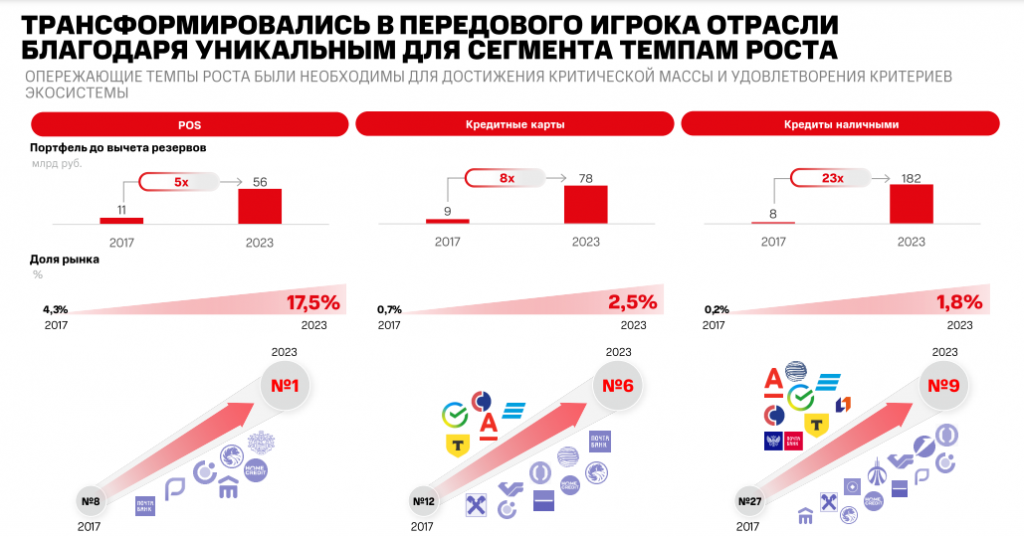 Показывают мощные темпы роста с низкой базы (хотя масштаб уже есть и в 2023 г. рост достаточно сильный: +39% по кредитному портфелю):