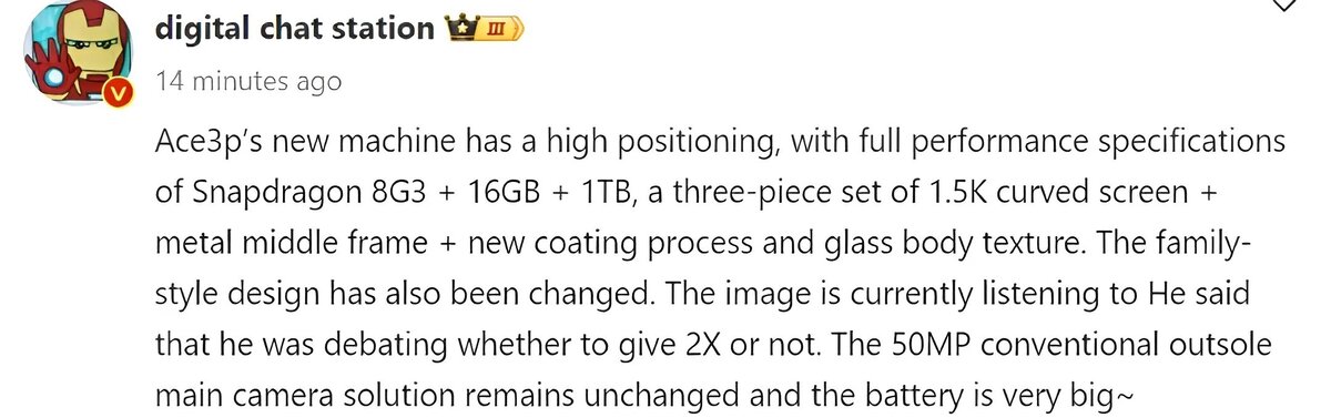 Из серии OnePlus Ace 2, выпущенной в прошлом году, Ace 2 Pro, представленный в августе, был самым мощным смартфоном. В этом году OnePlus уже выпустила в Китае модели Ace 3 и Ace 3V, и, похоже, OnePlus работает над Ace 3 Pro. Сегодня инсайдер Digital Chat Station поделился подробностями дизайна и спецификаций устройства. С точки зрения дизайна, OnePlus Ace 3 Pro будет оснащен OLED-панелью с изогнутыми краями на передней панели, металлической центральной рамкой и стеклянной задней панелью. Интересно, что новая информация говорит о том, что устройство будет отличаться дизайном задней панели от существующих флагманов OnePlus. Также стало известно, что разрешение у панели составит 1,5K. Под корпусом устройства будет установлен процессор Snapdragon 8 Gen 3, 16 ГБ оперативной памяти, 1 ТБ встроенного хранилища и большой аккумулятор. На задней панели устройства будет установлена 50-мегапиксельная основная камера, но пока неясно, будет ли она включать в себя 2-кратный телеобъектив. В качестве о