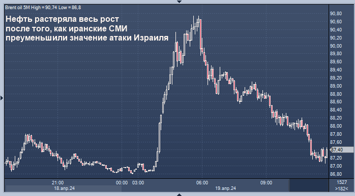 Официальные лица США утверждают, что Израиль нанес ответный удар по Тегерану. Фьючерсы на нефть марки Brent первоначально выросли более чем на 4%, но затем рост сдулся Нефть марки Brent интервалами в 5 минут Нефть растеряла все завоевания, полученные в результате предыдущего резкого скачка котировок, так как иранские СМИ, похоже, преуменьшили последствия израильских ударов, последовавших за беспрецедентным обстрелом Тегерана в минувшие часы. Нефть марки Brent торговалась с небольшими изменениями вблизи отметки 87 долларов за баррель после взлета более чем на 4 % выше 90 долларов на фоне возобновившихся опасений по поводу возможности более широкого конфликта, который может поставить под угрозу поставки нефти. Израиль нанес удар по Ирану, по словам двух официальных лиц США, но полуофициальное информационное агентство Исламской Республики Tasnim опровергло эти сообщения и заявило, что ядерный объект в Исфахане находится в безопасности. Полуофициальное информационное агентство Mehr процити