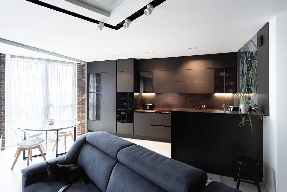 Совмещение с гостиной более требовательно к кухонному гарнитуру, особенно в квартире-студии, где он будет виден из комнаты. Выбирайте нейтральные стили и цвета, которые сочетаются с остальным интерьером.