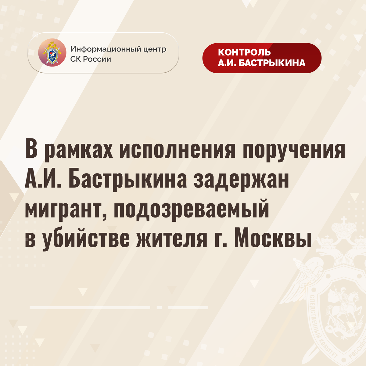 В рамках исполнения поручения А.И. Бастрыкина задержан мигрант, подозреваемый в убийстве жителя г. Москвы