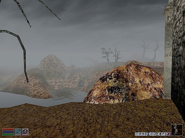 Прямо со станции спускаемся на берег в том месте, где стыдливый Хентус, у которого увели штаны, прятал в воде свой неприкрытый зад. Гнисис расположен недалеко от устья реки, туда и направляемся в первую очередь. Быстро добегаем до моря, ничего не обнаружив. Возвращаемся, На левом берегу остается сам город, потом форт Дариус. А вот справа, почти на уровне воды, дверь в крутом береговом откосе. Родовая гробница Фалас. Ничего сверху на нее не струится, но может, просто давно дождей не было.