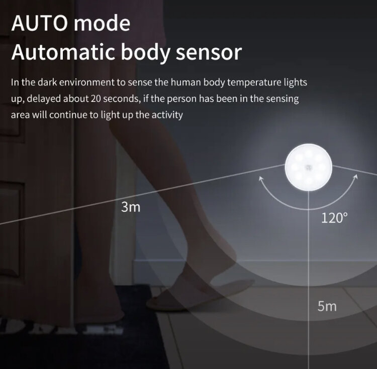 Сенсорная лампа также с датчиком освещенности, в автоматическом режиме она загорается только в условиях низкой освещенности. Если вы собираетесь его протестировать, поместите его в темное место. Характеристики: Название продукта: сенсорный ночник Режимы: режим зондирования или длительное освещение Цвет изделия: белый Цвет света: теплый белый (3000K) /холодный белый (6000K) Напряжение: 5 В Мощность: 0,6 W Вес брутто: 65 г Материал: АБС Емкость аккумулятора: 200 мАч Расстояние срабатывания: 0-5 м Угол чувствительности: 120 Угол наклона Размер изделия: 85x20 мм Количество светодиодных лампочек: 8 светодиодов (два цвета: 2x8 светодиодов) Особенности: 1. Свет датчика движения в помещении перезаряжаемый включается автоматически, когда вы приближаетесь в пределах 3-5 м, и автоматически выключается через 20 секунд после остановки движения. Идеально подходит для прихожих, туалетов, лестниц, подвалов и многих других коммерческих или жилых помещений. Делайте свою жизнь удобнее! 2.
