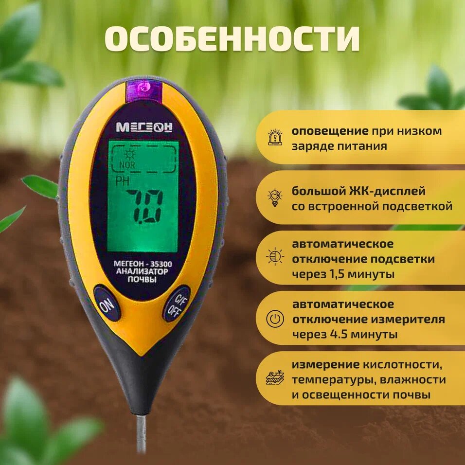 Особенностью данного прибора является то, что он разработан не для технических специалистов и инженеров, как большинство оборудования Мегеон, а для садовников, агрономов, дачников - для тех, кто, так или иначе, имеет отношение к проверке и выращиванию рассады или растений. Всего один портативный измерительный прибор дает возможность осуществлять непрерывный контроль за состоянием почвы. А, как известно, без правильно подготовленного грунта не будет расти ни одно растение.