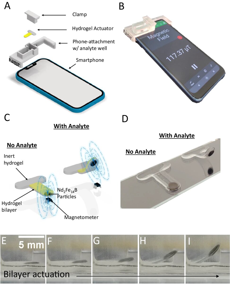 Насадка совместима с любым смартфоном, оснащенным магнитным датчиком, для работы используются специальные тест-полоски из биогидрогеля с включением магнитных наночастиц. Две полоски закладываются в насадку, а сверху устанавливается капсула с образцом жидкости. В зависимости от конкретного значения pH жидкости или от уровня глюкозы в биологической жидкости пациента верхняя полоска растягивается или сжимается. Намагниченные области также сдвигаются друг относительно друга и это смещение фиксирует встроенный в смартфон обычный магнитный датчик (компас). Ученые утверждают, что их прибор дает точные показания, но на массовый рынок выйти они пока не готовы, пока остаются не решенными вопросы по разработке массового производства гидрогелевых тест-полосок, а также способам создания их стабильными