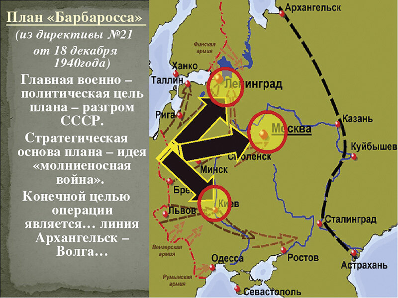 18 декабря 1940 год, а Адольф Гитлер утвердил директиву №21, известную всем как "план Барбаросса". Одна быстрая операция должна была разбить СССР. По плану предполагалось стремительное продвижение танковых частей для уничтожения соединений Красной армии. Конечная цель формулировалась так: отгородиться от азиатской России по общей линии Архангельск-Волга. Отсюда авиация могла уничтожить последние промышленные базы Советского Союза. Для всего этого дела были сформированы три группы армии: "Север", идущая на Ленинград, "Центр" - на Москву, и "Юг" - на Украину. Группу армии юга от двух других разделяли непроходимые болота. Поэтому поначалу ей нужно было действовать изолировано. Каждую группу армии поддерживал воздушный флот. Завершение операции планировалось через три четыре месяца. Подготовка к нападению была закончена к середине июня 1941 года.