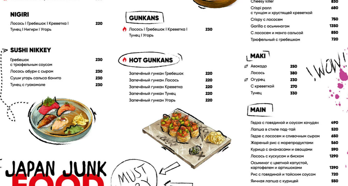 Меню не такое большое, как в империи "Тануки", например. Есть тартар, тунец, креветки, угри, нигири, разные суши, бургеры, азиатские супы, сашими, гунканы, гёдза, осьминог, лапша и десерты. В принципе все основные категории и традиционные блюда.