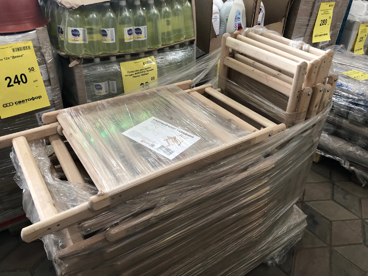 Во-первых, в продажу поступили деревянные садовые стулья. Они складные и имеют размеры 80*60*60 см. Максимальная нагрузка составляет 100 кг. Стулья изготовлены из дерева (липа) и произведены в городе Екатеринбурге. Цена за каждый стул всего 675 рублей, что является очень выгодным предложением.