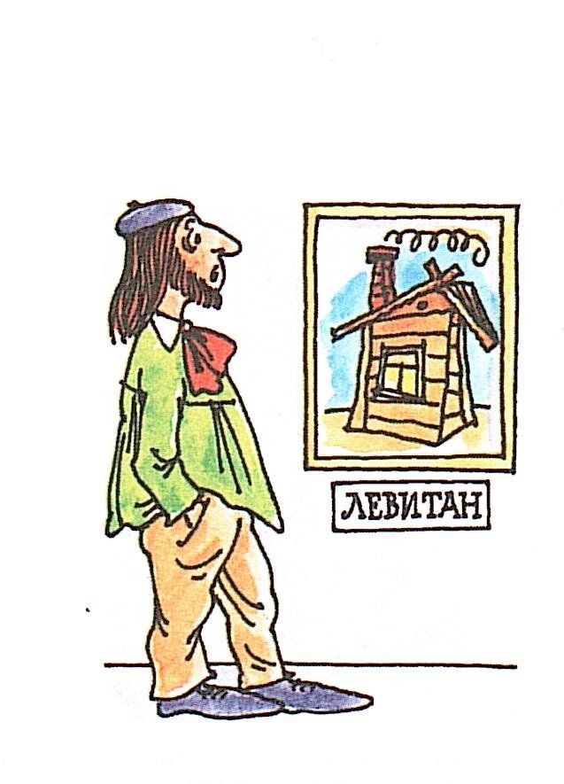 И чаще всего мишенью для шуток становятся коллеги. Но на любую критику есть универсальный ответ: "Я художник, я так вижу". Даже если художник "видит" Чёрный квадрат. По поводу шедевра Малевича коллеги сочинили побасенку, не вполне приличную, но действительно смешную. Некий психиатр ставил диагнозы на основании того, ЧТО именно увидит пациент в репродукции этого полотна. И вот, псих начал похихикивать: - Да это тёмная комната! В ней парочка выключила свет, и сейчас, сейчас... не убирайте! Посмотрю, как они там... - Уважаемый, да вы - маньяк! - А сами-то вы кто, доктор, если такие фотографии на работе держите? Но порой розыгрыши были совершенно оригинальны. Вот взгляните на рисунок и скажите: можно ли верить подписи под картиной? Оказывается, можно! Это композитор Никита Богословский упросил "нарисовать хоть что-нибудь" знаменитого диктора Юрия Левитана. Диктор пытался объяснить, что не умеет, но в конце концов уступил просьбе. Изобразил домик с трубой и дымом-спиралькой. Богословский о