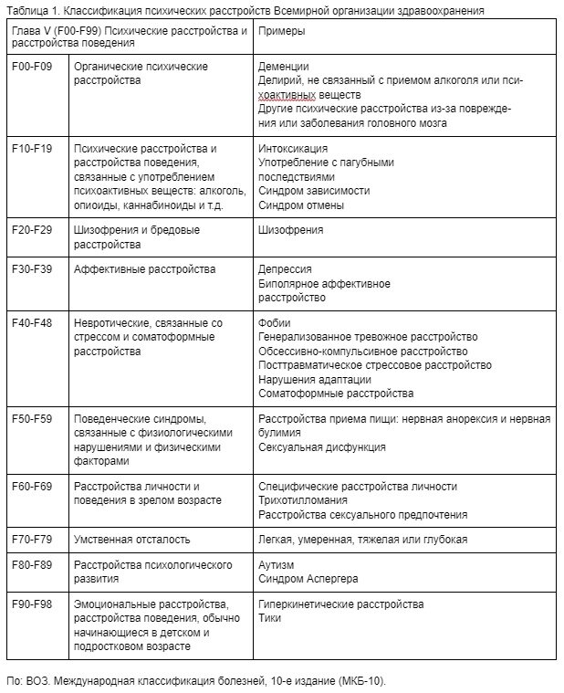 Диагнозы, перечисленные в табл.1, используются психиатрами всего мира в повседневной клинической практике, и именно этим заболеваниям посвящена настоящая глава. Психические расстройства являются одними из самых распространенных заболеваний у человека. Глобальное исследование бремени болезней ВОЗ показало, что на психические, неврологические расстройства и расстройства, вызванные злоупотреблением психоактивными веществами, приходится 28,5% лет жизни, потерянных из-за нетрудоспособности в целом. Распространенность психических расстройств различается в зависимости от ситуации: в общей популяции чаще всего встречаются депрессия, тревожные расстройства и расстройства адаптации (>10%), в то время как психозы бывают редко (<2%); в отделениях неотложной помощи больниц общего профиля, особенно среди ослабленных пожилых пациентов, очень часто встречаются органические расстройства, такие как делирий; в специализированных психиатрических отделениях самыми частыми расстройствами являются психозы.