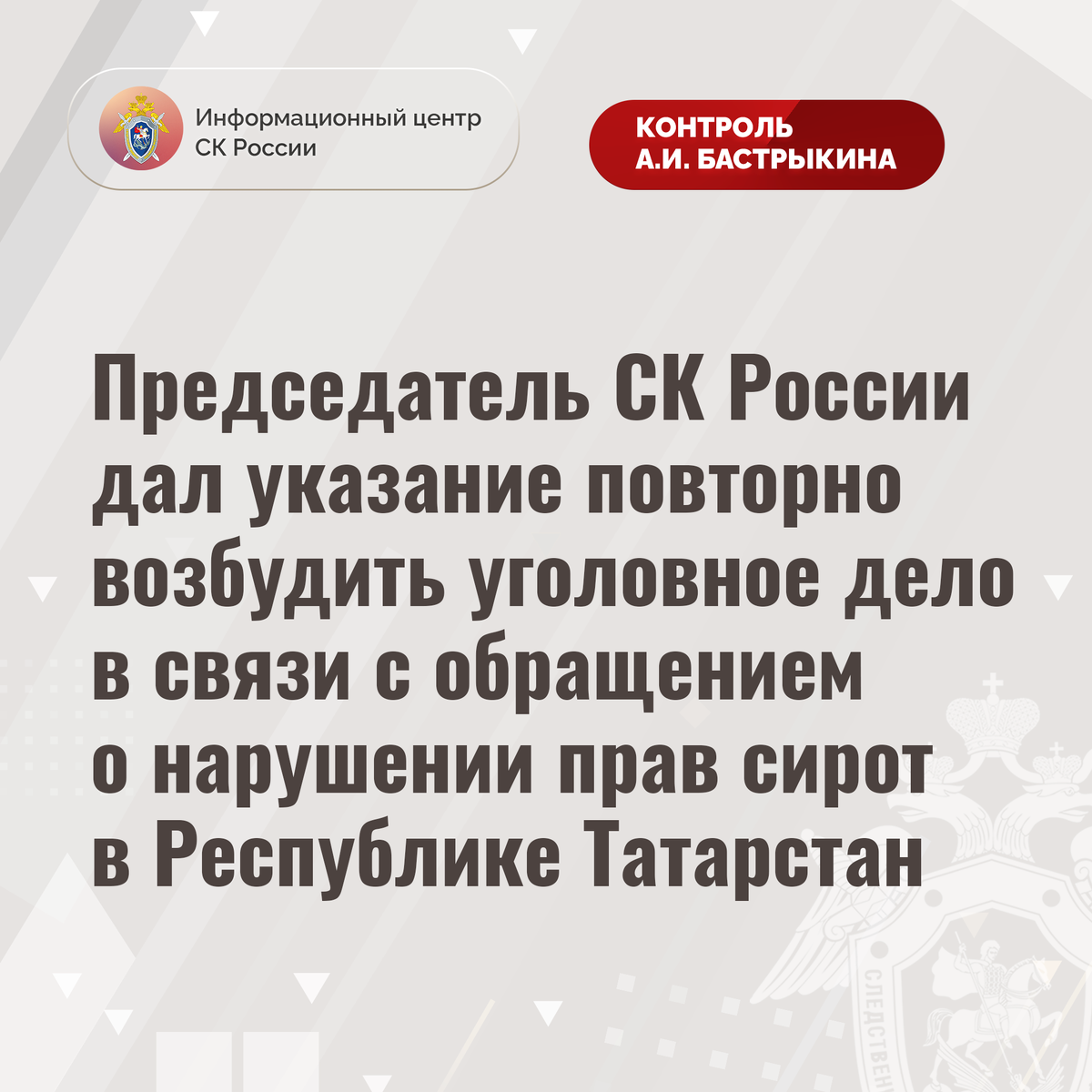 Председатель СК России дал указание повторно возбудить уголовное дело в связи с обращением о нарушении прав сирот в Республике Татарстан