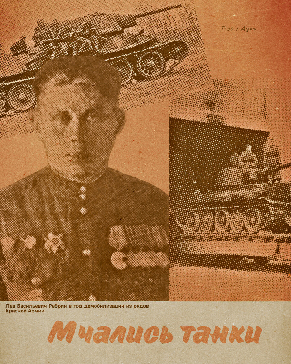 Лев Ребрин — участник всех боёв, которые вёл наш прославленный Уральский танковый добровольческий корпус. Семнадцатилетний свердловский токарь-комсомолец пришёл в корпус добровольцем по характеристике-рекомендации Ленинского райкома. В Нижнем Тагиле экипаж получил свою первую боевую машину, уральцы-воины помогали рабочим доукомплектовывать её, сами вели покраску. На этом-то танке и начал воевать Лев Ребрин.