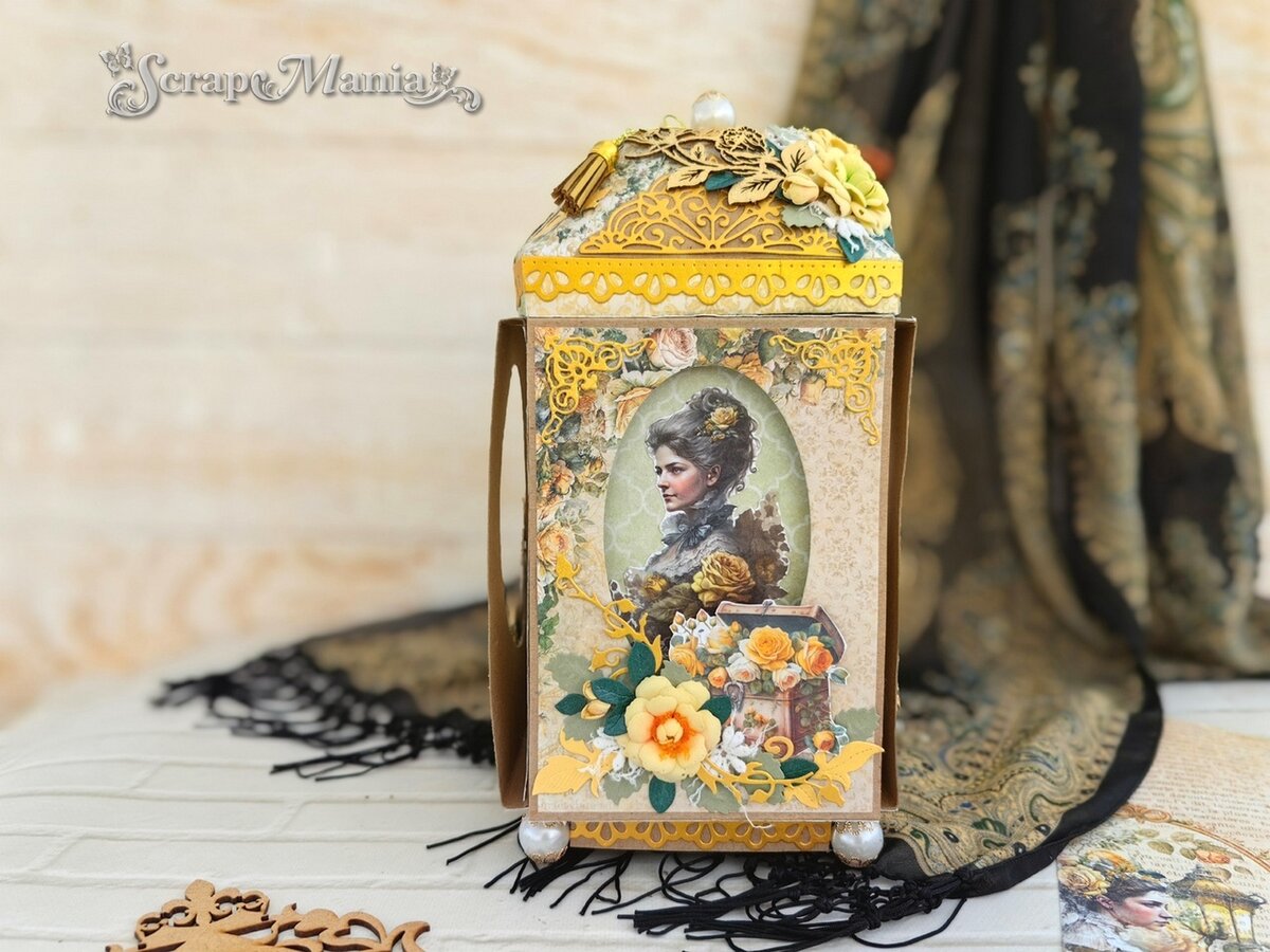 Доброго всем дня. Сегодня с вами Рамзиля Шикарная коллекция "Затерянная среди роз" с очень красивыми, восхитительными принтами и изящными предметами интерьера, утопающими среди желтых роз. Желтые розы веками вдохновляли поэтов, музыкантов и художников. Эти розы являются символом красоты и солнечного цвета символизируют радость, дружбу, счастье. И я решила сделать из этой коллекции необычную шкатулку в подарок, как символ дружбы и радости, которую мне приносит общение с этим прекрасным человеком. Высота шкатулки с крышкой 28см, ширина 14см, глубина внутри 19см. Сделала ее из плотного крафтового картона и обклеила со всех сторон листами из набора бумаги "Затерянная среди роз" Крышка в форме купола, на ней желтые розы из фоамирана, чипборд (покрыла желтой пудрой), фишка из набора. Верхушка увенчана большой "жемчужной бусиной" в золотой оправе, к которой прикреплены две подвески-кисточки на золотом шнуре. Ажурная салфетка из золотой бумаги вырублена ножом "Салфетка. Восточная". На каждо