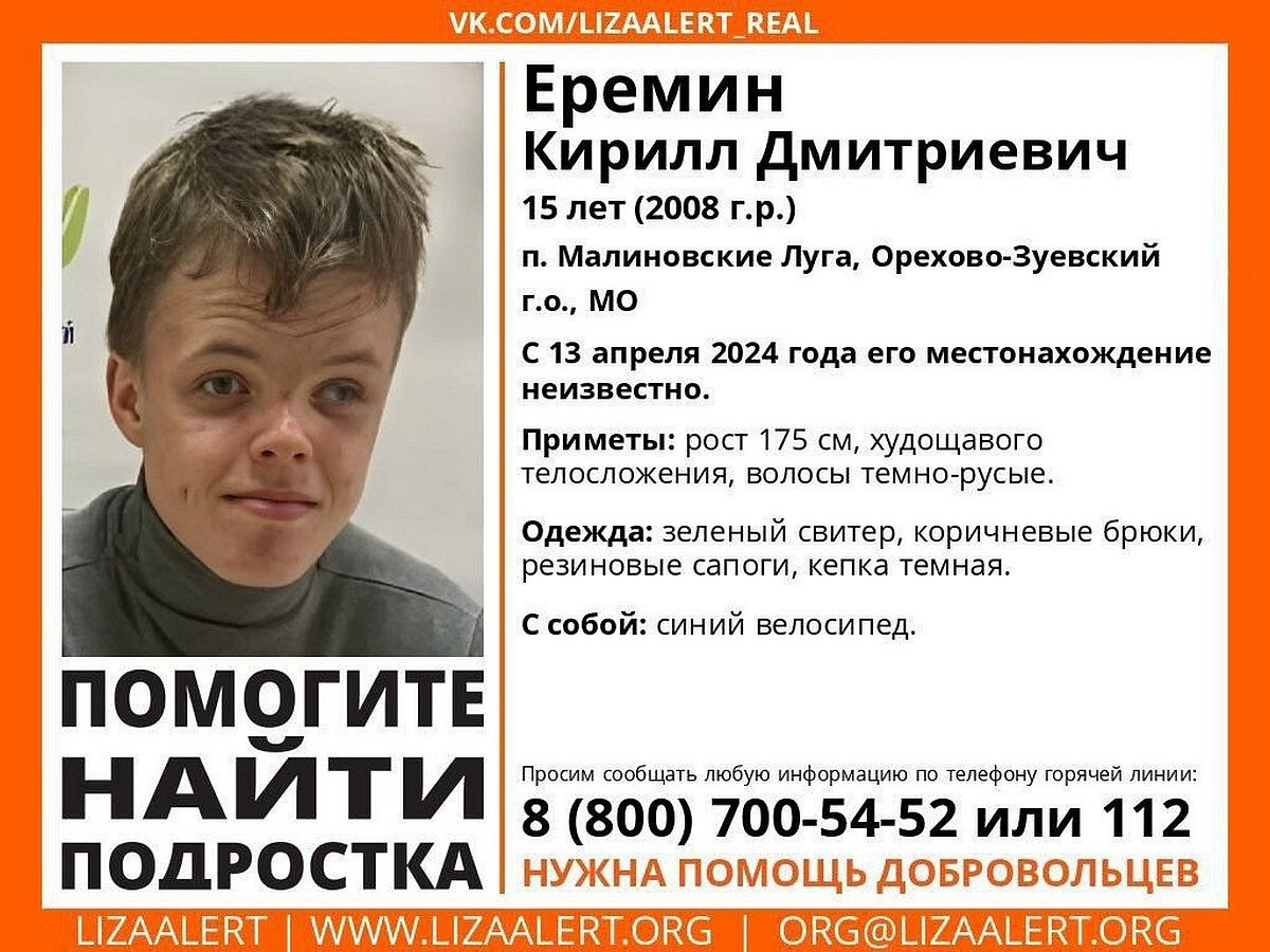 В Московской области неделю ищут пропавшего подростка В Московской области волонтёры уже неделю ведут активные поиски подростка из Орехово-Зуево. Пока они не дали никаких результатов. Кирилл Ерёмин проживает со своей бабушкой в Орехово-Зуево. Родители мальчика умерли, когда он был ещё маленьким. На прошлых выходных бабушка с внуком отправились на дачу. Пока пенсионерка занималась огородными делами, 15-летний Кирилл поехал кататься на велосипеде. Больше его не видели. У пропавшего мальчика есть особенности здоровья. Волонтёры проверяют водоёмы, чердаки и подвалы домов в районе, где пропал подросток. Если вы видели его или что-то знаете, отряд «Лиза Алерт» просит сообщить информацию по телефону: 8 (800) 700-54-52. Особые приметы Кирилла Ерёмина: рост — 175 сантиметров, худощавое телосложение. Тёмно-русые волосы. Он был одет в коричневые брюки и зелёных свитер. Мальчик уехал на синем велосипеде.