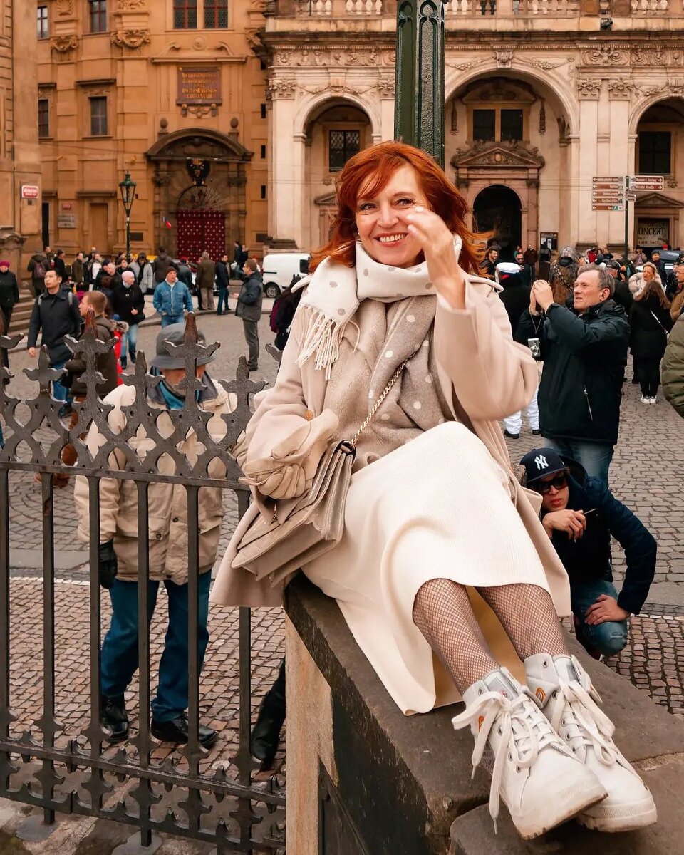 Покажу, как умело возрастные женщины смогли подобрать аксессуары к своим нарядам с учётом цветотипа внешности. Женщина с осенним цветотипом выбрала бордово-баклажановый оттенок для аксессуаров.