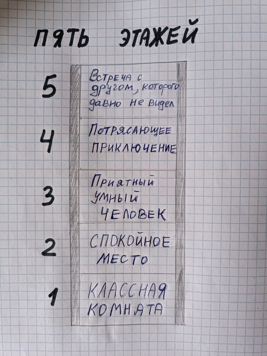 ➡️Выберите один из этажей. Закройте глаза и представьте, на каком из этажей вам хочется сейчас побывать. Что сейчас вам необходимо, чтобы вернуть себе жизненные ресурсы, снять усталость и напряжение.