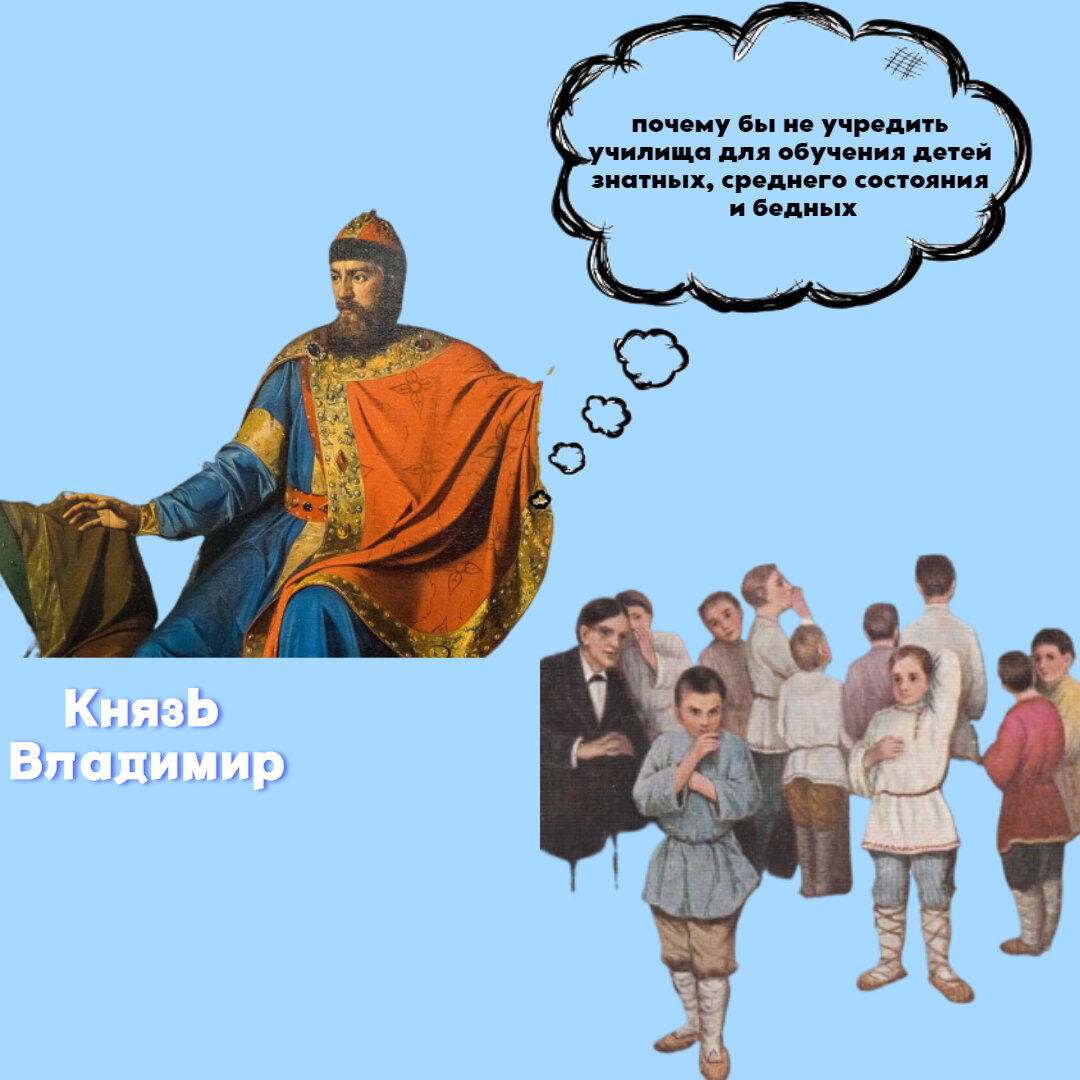 🔶 Князь Владимир положил начало и осуществил ряд по приобщению россиян к просвещению и культуре. Он учредил училища для обучения детей знатных, среднего состояния и бедных, видя в образовании детей одно из главных условий развития государства и духовного становления общества.