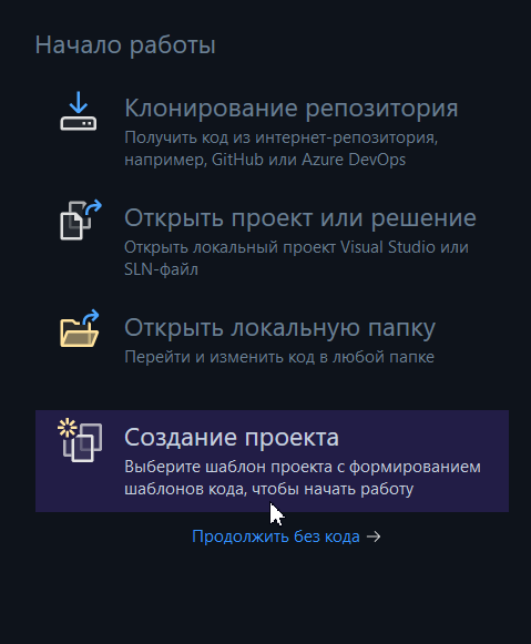 Нам необходимо создать свой первый проект. Запустим Visual Studio и нажмем "Создание проекта".