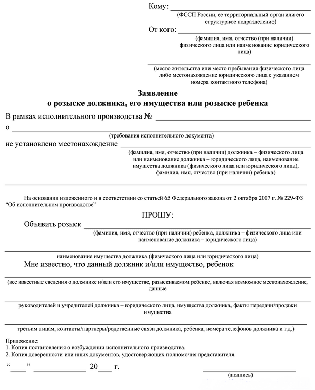 Заявление о розыске должника подается в специальную службу судебных приставов. В нем необходимо указать следующую информацию: