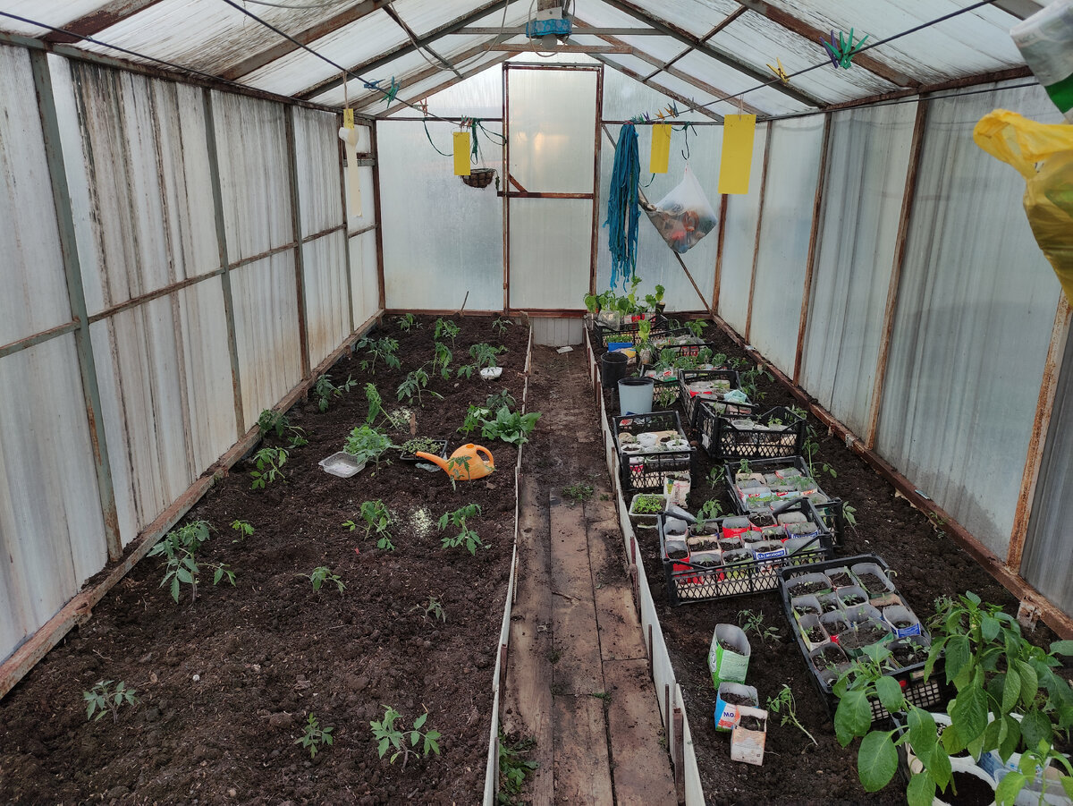 Теплица на Кубани — дело совсем не обязательное, но очень полезное. Зимой в ней зелень растёт, весной — рассада, летом — помидоры. В общем, сегодня 20 апреля, я высаживаю томаты из стаканчиков в грунт. Они уже месяц в теплице стоят, можно было и раньше высадить, но я сначала заморозков опасалась, а потом просто некогда было. Теплицу я уже обрабатывала перед тем, как рассаду вынести, подробно тут 👇 Сегодня землю перекопала, лунки сделала, в каждую положила гранулы от медведки. Да, химия, да, медведки уйдут к праотцам, но у меня другого выхода нет. Эти чудесные насекомые не съедят мои томаты, но вот перерезать стебель своими клешнями могут легко. Пока я этого своими глазами не увидела и не поняла, что половину высаженной рассады не спасти, я тоже жалела медведок. Про ловушки знаю, пробовала. Эффективность мне не понравилась. Сверху хорошо пролила водой, а сверху ещё водой с карагеном. Для чего? Это я с молью томатной начала превентивно бороться. И вот эти жёлтые липкие пластины тоже