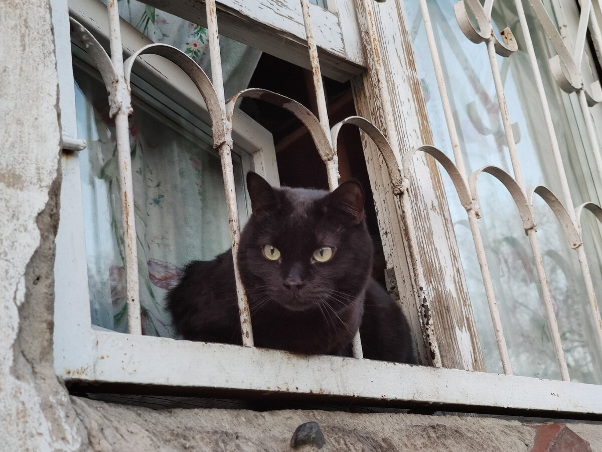 Как только теплеет, открывается окно и в нем появляются котики. Кто-то осматривает этот мир сквозь прутья решетки.