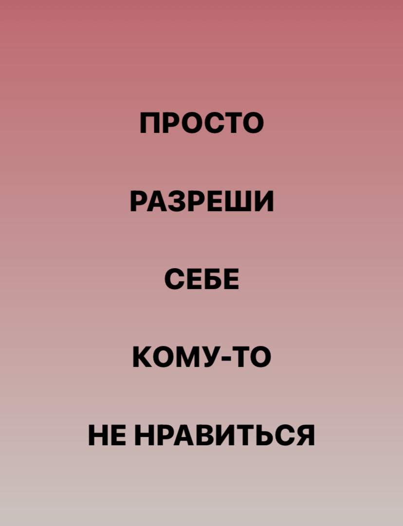 - Живешь в парадигме хорошей девочки и «что люди скажут», часто даже не осознавая этого. (Секрет №1: люди все равно скажут и возможно именно то, что ты боишься услышать. Потому что ты сама себе это все уже сказала внутри. А потом выругала и застыдила). - Берешь на себя ответственность за чужие реакции и эмоциональное состояние (Секрет №2: мы не можем контролировать чужие чувства и мысли, также как и погоду за окном). - Не в курсе, в чем твоя сила, а где твои ограничения (Секрет №3: Знать свои ограничения, это не гнобить себя за них, а уметь по-взрослому оценивать, вот это я могу сделать, а вот это - скорее всего, что нет). - Грызешь себя за ошибки и неудачи. А не понравиться кому-то в этом случае будет восприниматься исключительно, как провал. - Чужая неприязнь для тебя = с тобой что-то не так. И тогда ты сама себе уже не нравишься. Последний секрет на сегодня. Способ просто сказать себе: «Я разрешаю себе кому-то не понравиться» не работает. Потому что, если не понимаешь, почему ты себ