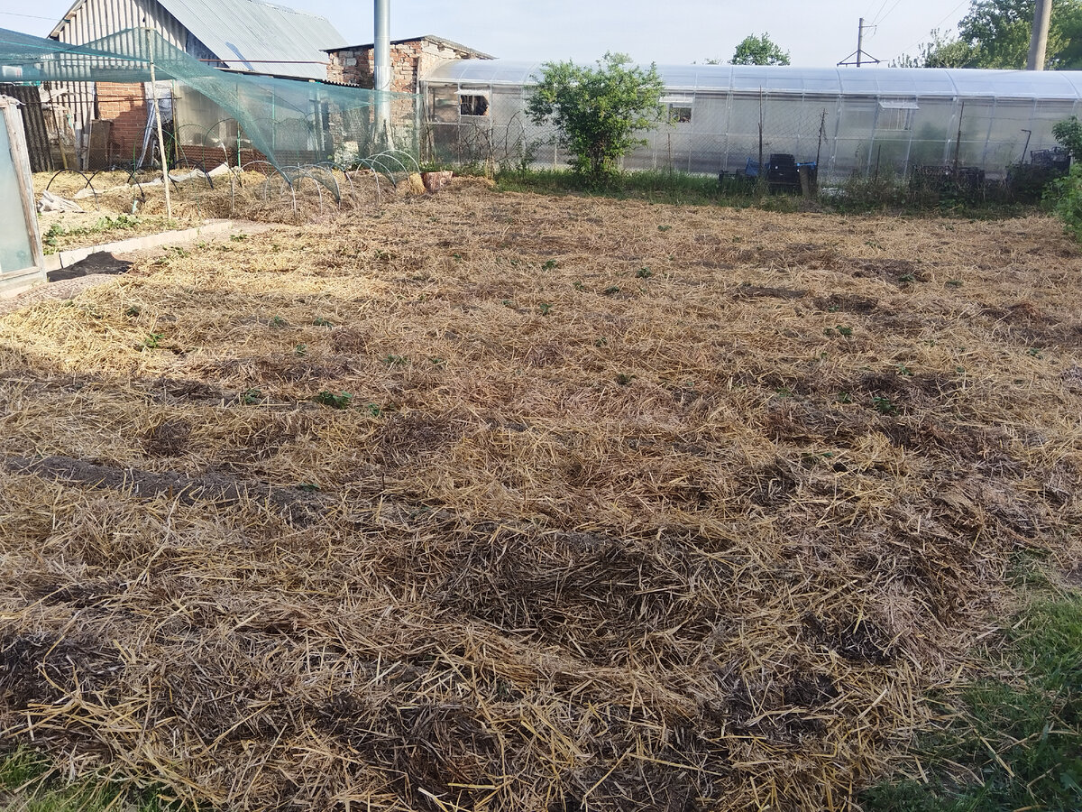 И обложили её сеном. Это поможет сохранить влагу и снизить температуру нагрева земли от солнца. В общем-то вопрос с картофелем решён, останется только выкопать.