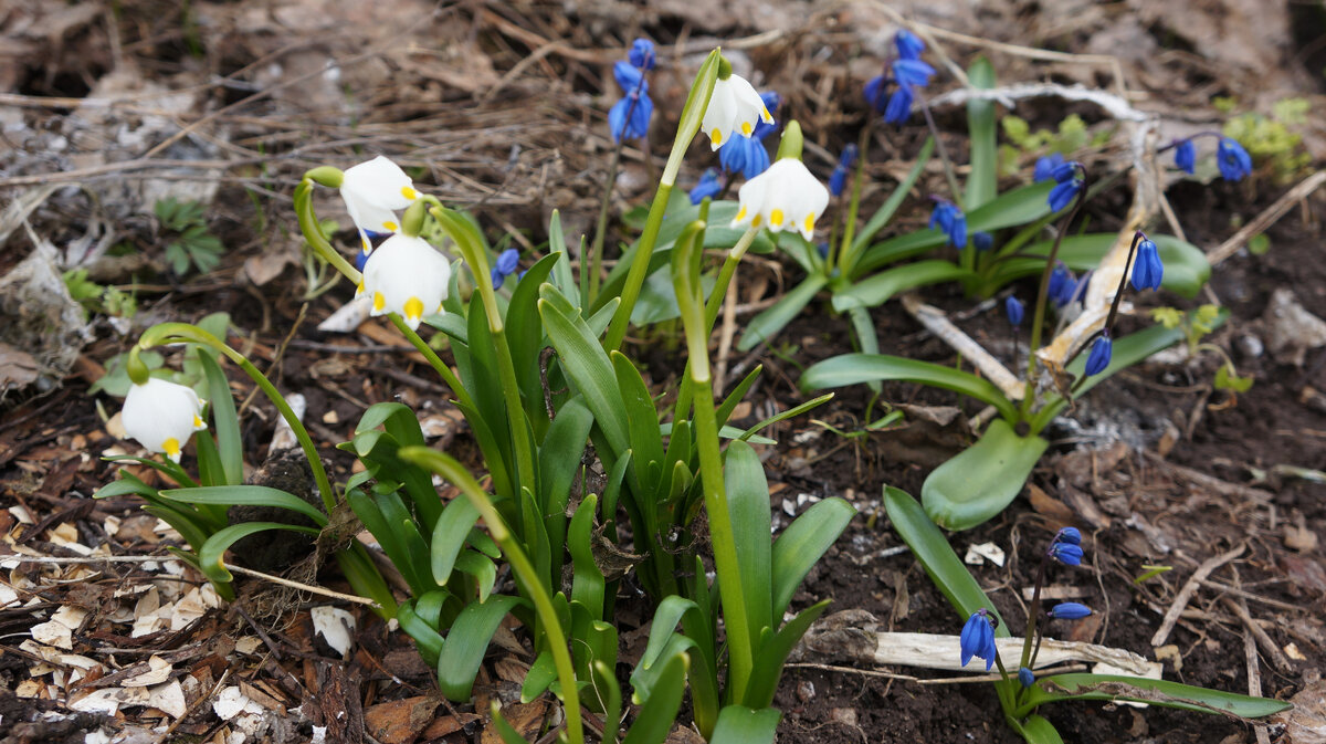 Снегопадов, как в Ленинградской области, нам не выдали, только ветерок нежно потрепал арматуру и профлисты. А сегодня днем выдали чудесное чистое и солнечное небо. На прошлой неделе еще цвели нежные полянки белоцветника и пролески: И распушились куртинки крокусов: Черемша набирает лист рядом с ними: За речкой полянка стала фиолетовой из-за цветения хохлатки. У нас ее тоже много, но не настолько: На этой неделе нежные первоцветы уже уходят. Белоцветник отцвел совсем, крокусы и пролески цветут единично. Эстафету подхватила медуница: Продолжает цвести белокопытник. Стало понятно, что он уже прилично разросся и есть что пересадить в темные задворки. К хохлатке присоединились букетики гусиного лука. Единичные цветы белой примулы превратились в шапки. Но я знаю, что это еще не предел. Еще видна зелень листьев за цветами. Ее скромный сородич. Полностью встрепенулась крупнокорневищная герань. И очень красива весенняя листва у рябинника рябинолистного: Приехал заказ корешков из интернет-магаз