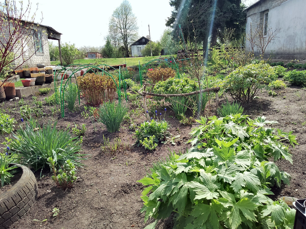 Территория прибавилась, работы естесственно тоже, а забор ещё не поставлен, поэтому не могу сооренттроваться куда и чего сажать. С соседкой сделали межевание, растения надо убирать. Бузину убрала, сегодня пересадила бузульник, немного лилейников, не могу придумать куда убрать гортезию, везде солнце. Надо ещё убрать шелковицу и три абрикоса, а вот справлюсь ли я с ними, вопрос. А пока мой сад, какой он сейчас, у нас сегодня +25, жарко. Большой цветник набирает обороты, растения поднимаются, начинают всходить лилии, монарды. Начинают цвести тюльпаны, самые простые, красные и попугайные. А это новые хохлаточки, подарки от девочек. Поднимаются герочки, их тоже немного, но я очень рада, что они у меня теперь есть. Еще одна яркая красотка. Цветет Брукнера вариегата, совсем кроха. Начинают цвести примулы. Похорошела горка, вот только арабиса нет, видно сопрел под снегом, а какой шикарный куст был. А вот колокольчик карпатский растёт отлично. Расползается тимьян вариегатный. Хоро