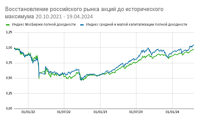 Если посмотреть на динамику индекса Московской биржи средней и малой капитализации полной доходности, то этот индекс обновил исторический максимум. 20 октября 2021 года индекс был на уровне 3378 пунктов, это максимальное значение до февраля 2022 года, 19 апреля 2024 года значение этого индекса было уже 3518 пунктов. Можно ли смотреть на индекс средней и малой капитализации и говорить про восстановление всего рынка? Да, индекс компаний средней и малой капитализации хорошо отражает всю экономику, так как компании в индексе представляют разные отрасли. Обычный индекс Московской биржи имеет уклон в сторону нефтегазового сектора, так как крупнейшие компании исторически именно из этого сектора. И хотя в индексе Московской биржи много крупных несырьевых компаний — Сбербанк, «Магнит», «Тинькофф», МТС и так далее, но именно в индексе компаний средней и малой капитализации большая диверсификация по отраслям экономики, в которых работают эти компании. Среди таких компаний — «Хэдхантер», «ВК», «Ро