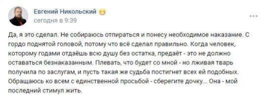 Кандидат в депутаты убил жену и сделал страшное признание в сети. Инцидент произошел в Ржевском районе Тверской области, об этом стало известно в субботу, 20 апреля. Евгений Никольский, который в Твери проходил кандидатом в депутаты в местную думу от «Справедливой России», убил 36-летнюю супругу. О расправе он якобы сообщил в сети. На его странице было сказано, что «лживая тварь получила по заслугам». Также мужчина попросила позаботиться об их совместном ребенке, 10 месяцев назад у предполагаемого убийцы родилась дочка. Известно, что жена Никольского занималась общественной деятельностью, преподавала детям танцы. Не исключено, что причиной трагедии мог стать семейный конфликт и ревность. Полную картину произошедшего предстоит установить следователям. Евгений Никольский в настоящее время задержан.