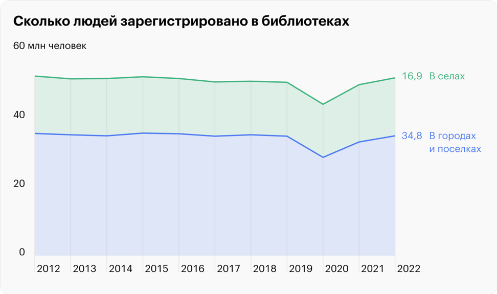 В целом стационарная посещаемость библиотек на протяжении последних десяти лет остается стабильной — на уровне 420 млн посещений. Единственное исключение — 2020 год, когда вводили ограничения из-за коронавируса. Тогда Роспотребнадзор разработал специальные требования для библиотек: например, читателям нельзя было самим выбирать книги на выставочных стеллажах. Во время пандемии число личных посещений библиотек начало падать, а количество удаленных пользователей выросло.