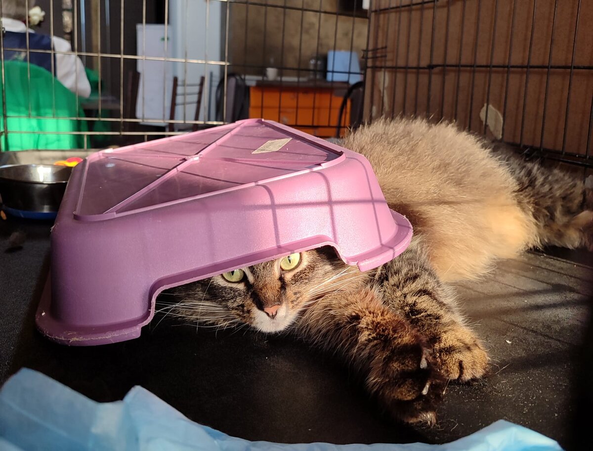Но история Хлопуша начинается как раз оттуда. Единственное место, где в оставленных на зиму снт происходит какая-никакая жизнь, это именно помойка. Которую уехавшие и оставившие пушистых сезонных друзей владельцы дач (людьми назвать сложно) накрыли брезентом - ну, чтобы кошки не мусорили.. Без комментариев, в общем. Хлопуш в числе десятка других кошек, брошенных и столпившихся у мусорки, отвезли в Москву, хотя бы на стерилизацию. И выпустить обратно рука уже не поднялась.