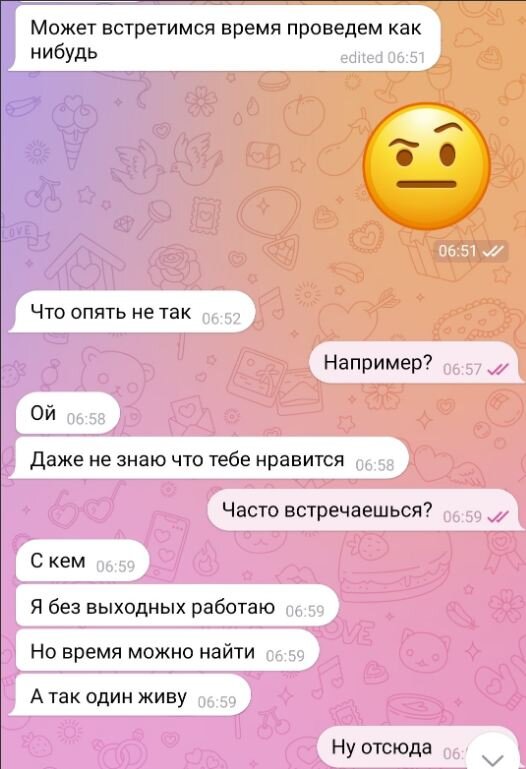 Написал парень, и я точно помнила, что мы с ним общались, но не помнила, почему перестали (скорее всего просил фото, а я не вижу смысла их всем подряд скидывать, если человек даже общаться не может, то смысл). Общались мы с другого акка, либо он удалил переписку и забыл (я меняю анкету время от времени). Иногда даю людям 2 шанс, но это зря: если вас раз разочаровал парень, не тратьте на него больше время. Больше всего меня раздражает нынешняя тенденция мужиков прибедняться, что вот они на 23523957 работах работают, домой только поспать часа на 3 заходят, готовить времени нету и т. д., но девушку им вынь да положь! Женщина - это не мягкая игрушка. Ей надо уделять время и внимание. Если вы выбрали для себя работать с утра до вечера - это только ваша проблема, тем более, если вы при этом не тратите деньги на девушку. Почему она должна сидеть одна и скучать, пока вы зарабатываете СЕБЕ на квартиру и машину? Окей, мне всегда не сложно дать совет, вот прямо действенный и простой: жалуетс