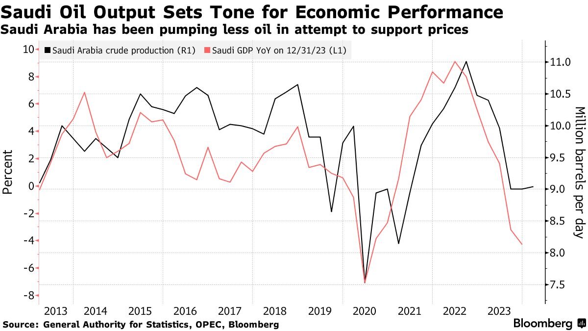 Саудовская Аравия — главный актор цен на нефть. Потому что именно она несет основную нагрузку в сокращении добычи нефти в рамках ОПЕК+. Чего это ей стоит? 1️. Для стабильного роста экономики добыча нефти в Саудовской Аравии должна быть 10-10,5 млн барр/сут. На 1-1,5 млн барр/сут. выше, чем сейчас. При нынешнем объеме добычи Саудовская Аравия загоняет свою экономику в глубокий минус, несмотря на высокие цены на нефть. 2️. С другой стороны, для баланса бюджета Саудовской Аравии нужны цены на нефть в 2024 году в районе $96/барр. Но никакой трагедии в небольшом дефиците бюджета в Саудовской Аравии, конечно, не будет. Кто угодно с радостью профинансирует рост долга страны. Похоже, пришла пора для Саудовской Аравии потихоньку отказываться от ограничений на добычу нефти в рамках ОПЕК+. МВФ считает так же. По ее прогнозу, ОПЕК+ с июля начнет постепенно увеличивать добычу нефти, а с 2025 года — полностью откажется от ограничений. Цены на нефть в таком случае должны будут показать тренд к снижен
