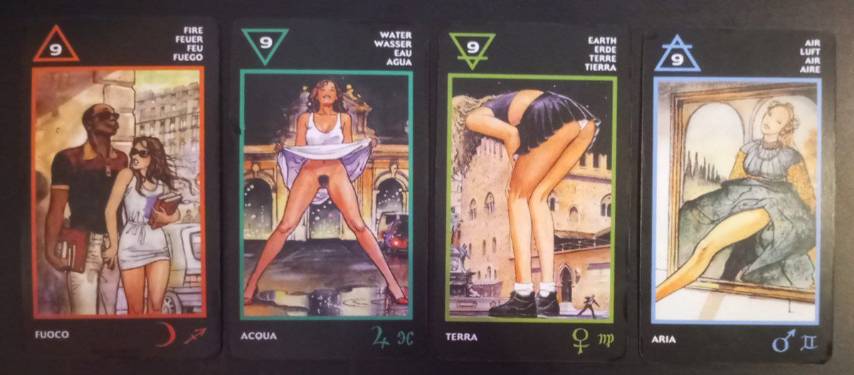Все девятки в Таро Манара связаны с расширением горизонтов, обилием чувств, сильными эмоциями. Девятки - это преувеличение, гиперболизация, изобилие, полнота. Девятки отражают также возможности роста, развития как отношений, так и внутренних качеств личности. Девятка огня Девятка огня символизирует накопление опыта, расширение горизонтов отношений, желание попробовать что-то необычное, внести разнообразие. Карта олицетворяет сильный сексуальный и интеллектуальный интерес, свободу от условностей и предрассудков, готовность на многое закрывать глаза и не замечать различий. Ключевые слова карты: различия, свобода от стереотипов, жизнь здесь и сейчас, любопытство, общие интересы. Перевёрнутое значение: люди слишком разные и не могут быть вместе из-за предрассудков и мнения со стороны. Отношения комфортные, со значительной разницей между партнёрами, люди не боятся осуждения, хотя их пару трудно назвать гармоничной. Чувство симпатии, взаимного интереса, увлечённости друг другом, комфортн