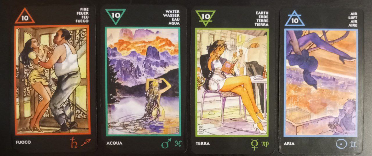 Все десятки в Таро Манара связаны с переизбытком эмоций, чувств, энергии, поиском чего-то нового. Десятки - это конфликт между желаемым и действительным, чувствами и разумом, стремлениями и возможностями. Десятки отражают также излишество, развитие, изменения и постоянные поиски. Десятка огня Десятка огня символизирует давление, претензии, накал страстей, эмоциональный предел, люди друг с другом не могут себя контролировать. Карта олицетворяет сильные разногласия, перебор силы, излишнюю настойчивость, неумение держать при себе эмоции, раздражение. Ключевые слова карты: различия, недовольство, грубость, ссоры, столкновения, запугивание, запрет, унижение, принуждение, нервный срыв. Перевёрнутое значение: нас*лие, жестокость, домашняя тирания, агрессия, запугивание, аб*юз. Отношения явно негативные, много взаимных претензий, обид, постоянные скандалы, разборки, рукоприкладство. Чувства отсутствуют, только ярость и ненависть, злоба, раздражение и плохо скрываемая агрессия. С*кс может б