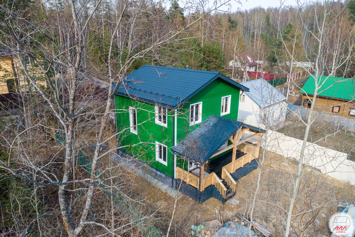 Наш прошлогодний объект в Гарболово, где мы проводили III этап стройки: Третий этап в этот раз был разбит на две части, так что мы занимались только фасадными работами. Смонтирован фиброцементный сайдинг Дековер: Промежуточные этапы отделки фасада я уже показывал раньше: Было даже довольно подробное видео: Зелёный цвет, быть может, не всем понравится, но тут уж на вкус и цвет: У дома довольно большая терраса площадью около 20 м2: Дом на ленточном фундаменте с плитным перекрытием, посадка довольно высокая, что приводит нас к четырём ступенькам при входе на террасу: Цоколь получился в целом массивный, но с этим ничего не поделаешь: Деревянное ограждение требует покраски на этапе чистовой отделки: Посмотрим на крыльцо вблизи: Поднимемся по ступенькам: Тёмная подшивка потолка и свесов крыши гармонирует с тёмным полом, за счёт чего терраса кажется более тёмной. Сложно сказать, удачное ли это решение, но смотрится, по-моему, неплохо: С другой стороны: С фонариков на стенах ещё не снята плён