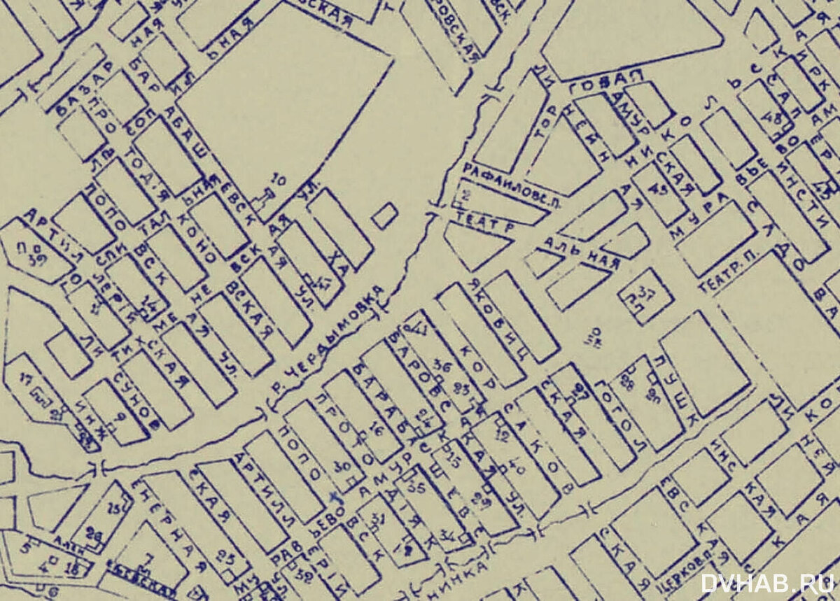 Здесь, на площади Ленина, улица Пушкина заканчивалась. Чтобы пройти дальше к речке Чердымовке (ныне Амурский бульвар), надо было сделать крюк и свернуть на улицу Театральную, которая шла странной диагональю.