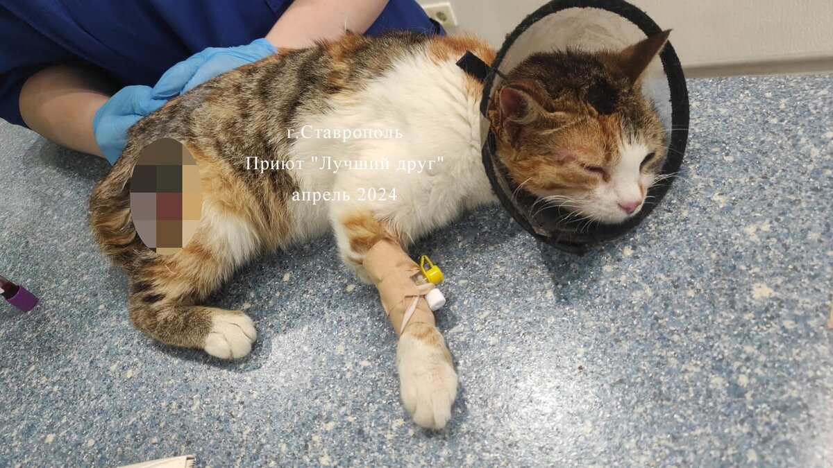 Трехцветная красивая кошка с огромными ранами прибилась к частному дому в юго-западном районе. У бедняги рваные раны от собачьих зубов, текут глаза, уши забиты грязью. Люди не выгнали, отнесли к врачу, начали лечить, но справиться не смогли и попросили помощь. Кошку отправили на стационар с температурой 40, рану зачистили, поставили дренаж. У кошки ушной клещ, отодектоз и вирусное заболевание под вопросом.