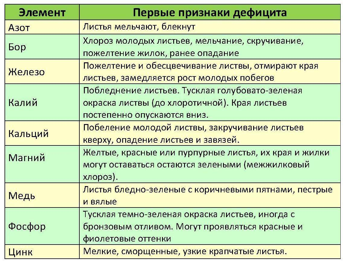 В таблицах так же указаны признаки недостатка этих элементов, которые мы можем увидеть на своем растении,